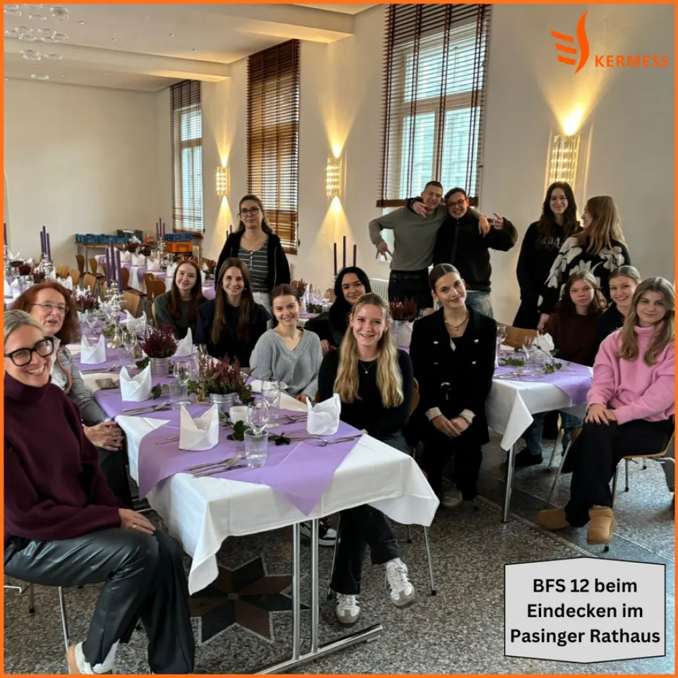 Die Schüler:innen der BFS 12 der Berufsfachschule Kermess hatten im November die Gelegenheit, ihr erlerntes Fachwissen direkt in der Praxis umzusetzen. Im Pasinger Rathaus übernahmen sie mit viel Engagement und Professionalität das fachgerechte Eindecken der Tische und bewiesen dabei ihr Können in der Gastronomie. Diese praktische Erfahrung bot ihnen nicht nur wertvolle Einblicke in den Berufsalltag, sondern auch die Möglichkeit, ihr erlerntes Wissen in einem realen Umfeld anzuwenden. Die Veranstaltung war ein voller Erfolg und unterstreicht die hohe Ausbildungsqualität der Berufsfachschule Kermess. 🍽🧡
